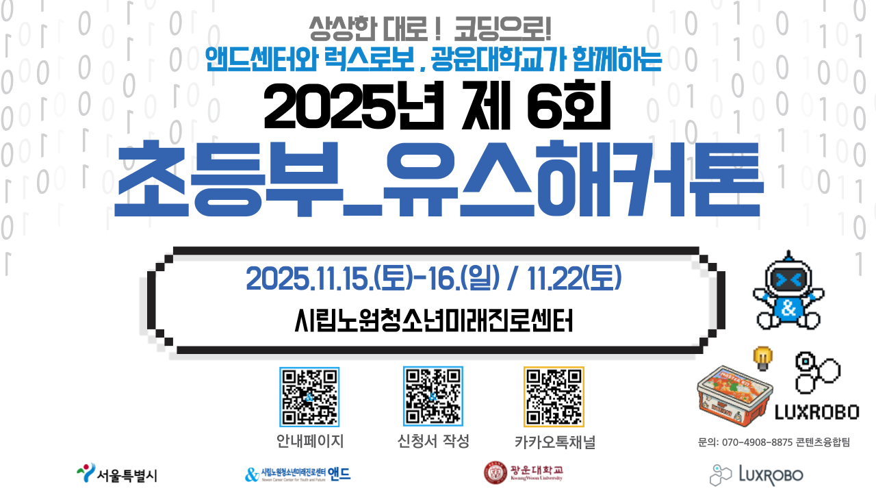 모집 연장! 선착순 마감 시까지 !10/30 17:18 기준 19팀 모집 완료 / 잔여 1팀모집 현황 해당 페이지에 게시합니다.앤드센터와 럭스로보, 광운대학교 인공지능융합대학가 함께하는2025년 제 6회 유스해커톤 초등부참가자를 모집합니다.모집 기간 : 10월 14일(화) ~ 마감시 까지 선착순 접수▼초등부 접수▼https://forms.gle/QMKZvA5iGEKweusC8위 파일은 아래 첨부파일로도 확인 가능합니다:)●참가자격11세~13세 초등학생※2인 팀으로 접수 가능 ●대회 내용아이디어 기획 및 코딩모듈(MODI) 이용 창작 (주제 추후 공개) ●참가비- 없음(신청 후 취소 시, 추후 센터 프로그램 이용에 제한이 있을 수 있습니다) ●제공 사항모디 개발사(럭스로보) 특별 강의 진행광운대학교 인공지능융합대학 재학생 전문 멘토링우수팀 대상 상장 및 부상 기초코딩 및 교보재 활용 관련 오프라인 기초 교육대회 참가에 필요한 기자재 일체(노트북, 장비 등) ●대회 일정-접수 기간 : 10월 14일(화) ~선착순 접수-참가자 발표 : 10월 중-오리엔테이션 : 11월 15일(토) 10:00~12:00-오프라인 교육 : 11월 15일(토), 11월 16일(일) 10:00~17:00, 앤드센터-대회 개최 : 11월 22일(토) 10:00~15:00, 앤드센터-시상식 : 11월 22일(토) 15:00~17:00※ 상황에 따라 일정은 변경될 수 있음. ●접수 방법1) 구글폼 신청서를 통해 접수 https://forms.gle/QMKZvA5iGEKweusC82) 초등부 포스터 내 QR코드 또는 링크 접속※ 신청 후 부득이한 이유로 취소 시, 담당자에게 연락 부탁드립니다.●문의- 콘텐츠융합팀 유스해커톤담당자 ☎070-4908-8875- 카카오톡 문의하기 : https://pf.kakao.com/_slWSxb● 전년도 활동 영상 - 1일차 https://youtu.be/kkf1b92g3hM - 2일차 https://youtu.be/uOcq0LrV64U
