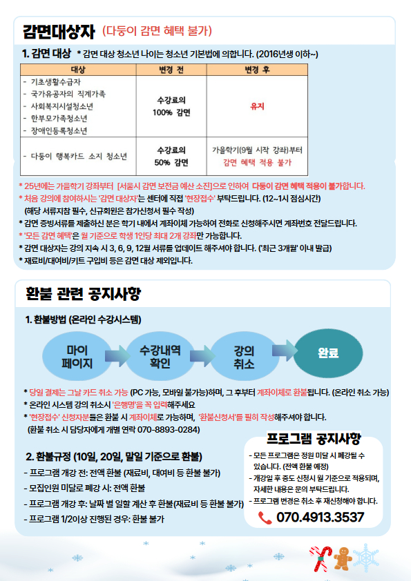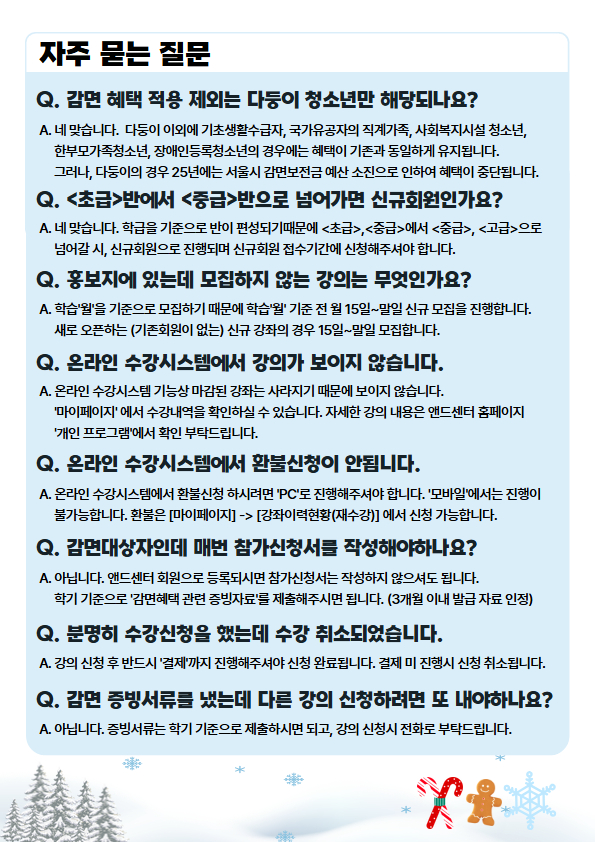 다둥이 제외 감면 대상자는 겨울학기 시작으로 증빙 서류 업데이트가 필요하니 현장 접수 부탁드립니다.