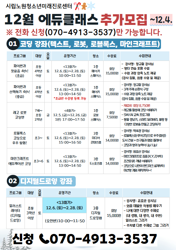 추가 모집은 전화 신청만 가능합니다. 아래 번호로 전화 신청 부탁드립니다:)