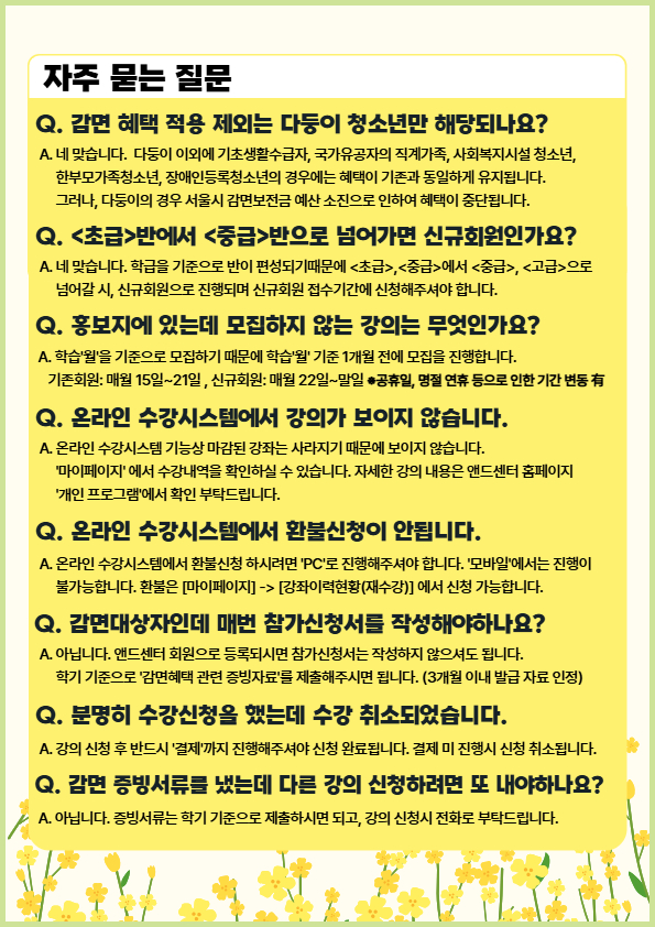 새학기 시작으로, 다둥이 제외 감면 대상자의 경우 증빙 서류가 필요하니 현장 접수 부탁드립니다. (1개월 이내 제출한 자 제외)