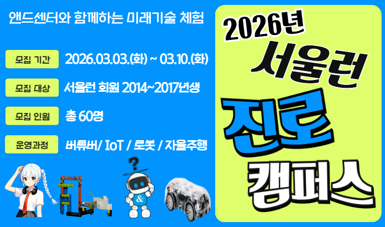 안녕하세요, 앤드센터입니다! 12월까지 열띤 활동을 마무리하고, 다시 돌아온 청소년운영위원회 꿈IT기 입니다:)청소년운영위원회는 8기는 앤드센터의 청소년 대표로서, 매월 2회 만나는 것을 목표로 하고 있습니다.1. 시설 및 프로그램 모니터링2. 지역 축제 참여3. 타 청소년운영위원회와 교류활동4. 자치기구와 함께하는 신나는 워크숍!5. 다양한 역량강화교육(미래기술,리더십)6. 사회참여활동(주민참여예산 제도 등)그리고 !!새로운 친구들과 맛난 간식!!까지....★ 더 탄탄히 정비하고 돌아온 청운위 많은 관심 부탁드립니다>_<1. 모집/신청기간2026년 1월 24일 (토) ~ 2월 18일 (토) 18시까지2. 대상9세~24세 청소년 누구나!!3. 선발과정신청서 제출 > 면접 > 선발 공고 > OT*선발 위원 OT 필수 참여4. 면접 일정3월 7일 (토) 1차 10~12시 또는 2차 14~16시5. 선발 공고3월 10일 (화) 14시 앤드센터 홈페이지 게시 및 개별 연락6. OT 일시3월 28일 (토) 14~16시 *기관 사정에 따라 변동 될 수 있음☆신청 페이지☆https://forms.gle/nXTKkuxki7XVKAXk6이번 신청 기간을 놓치면 내년에 만나야하니, 놓치지 말고 신청해주세요 ^3^!!문의는 아래 번호로 전화주시면 자세히 답변드리겠습니다:)☎메이커드림팀 070-4913-3537(운영시간 화요일부터 토요일 9~18시)