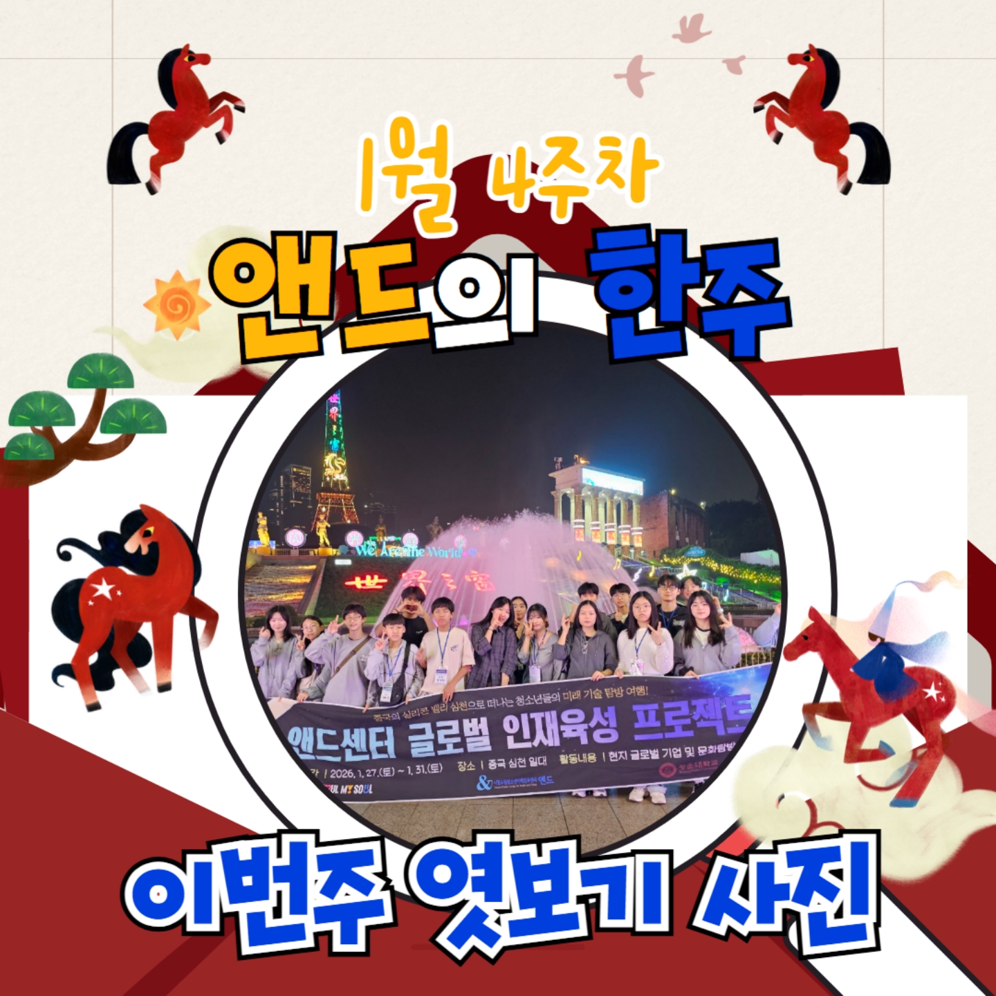 [앤드의 한주] 1월 4주차[앤드의 한주] 1월 4주차지난 주 앤드에서 어떤 활동이 있었을까요~!?앤드센터에서는 심천으로 떠나는 글로벌인재육성프로젝트가 진행되었어요!해외에 처음 나가는 친구들, 새로운 경험과 진로에 대한 고민으로 참가한 친구들도 있었는데요!모두 의미있는 경험을 하고 돌아왔답니다!! ^^ 방학중에도 계속해서 멀티플랙스와 앤드디지털놀이터가 운영중이에요~!!! 앤드센터로 놀러오세요 ^^