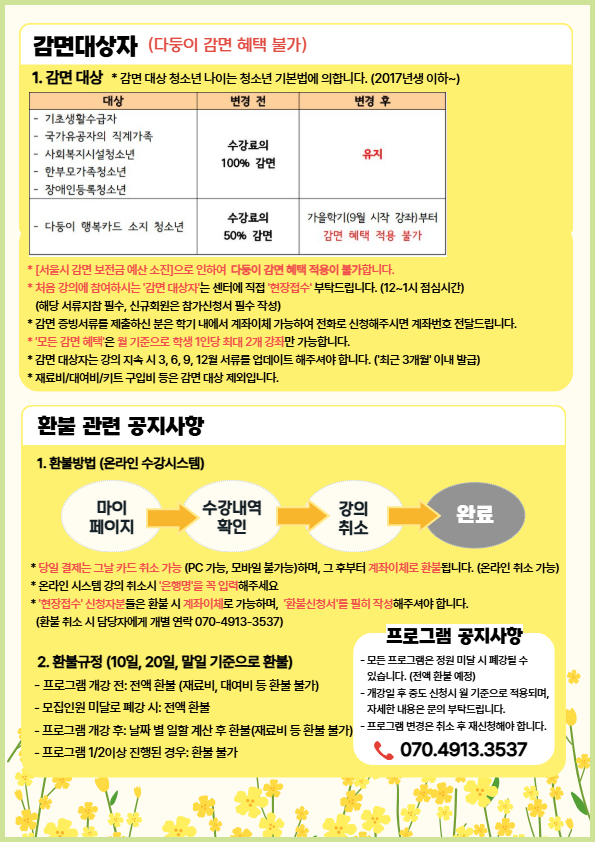 새학기 시작으로, 다둥이 제외 감면 대상자의 경우 증빙 서류가 필요하니 현장 접수 부탁드립니다. (1개월 이내 제출한 자 제외)