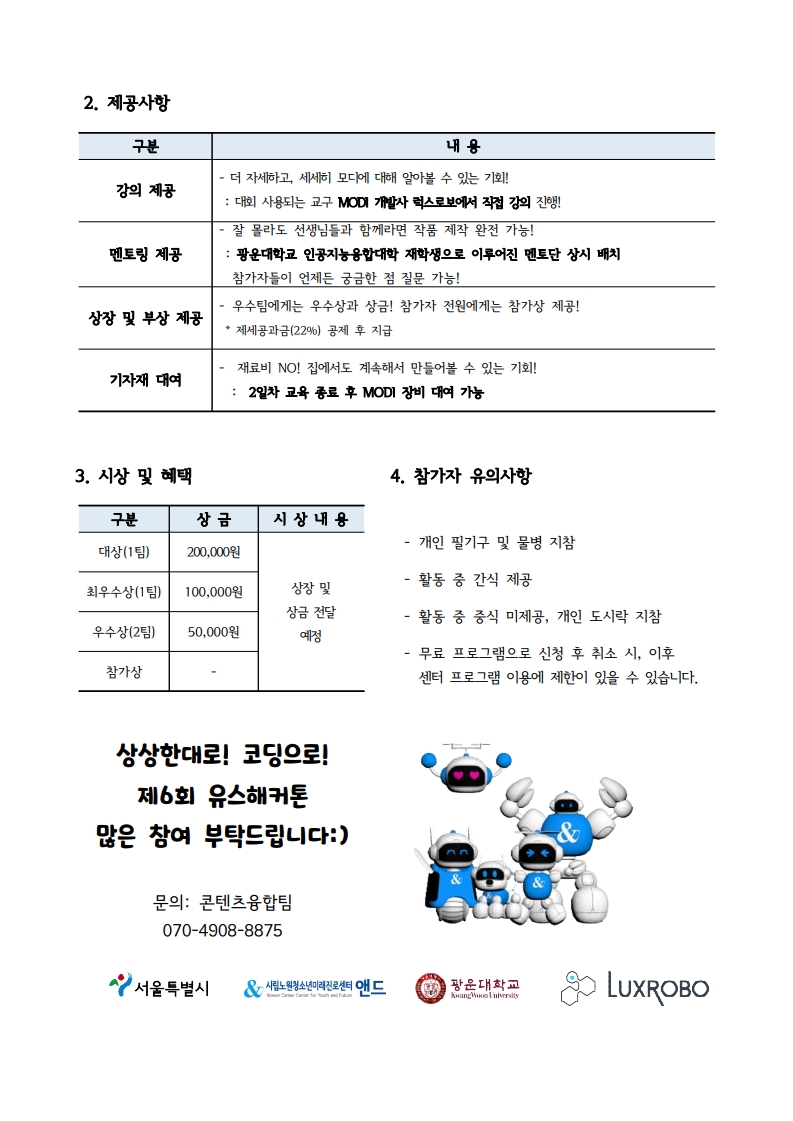- 콘텐츠융합팀 유스해커톤담당자 ☎070-4908-8875